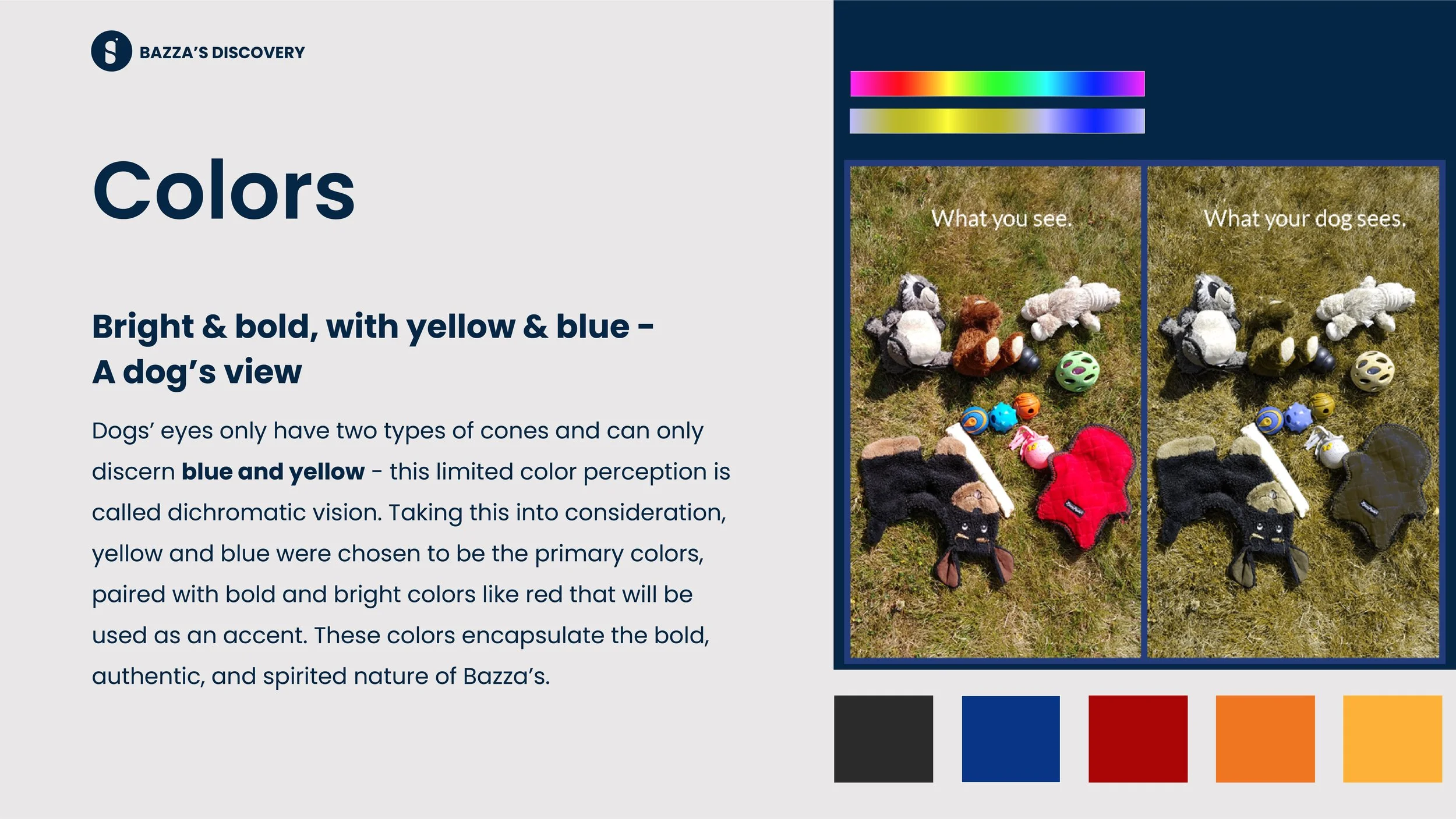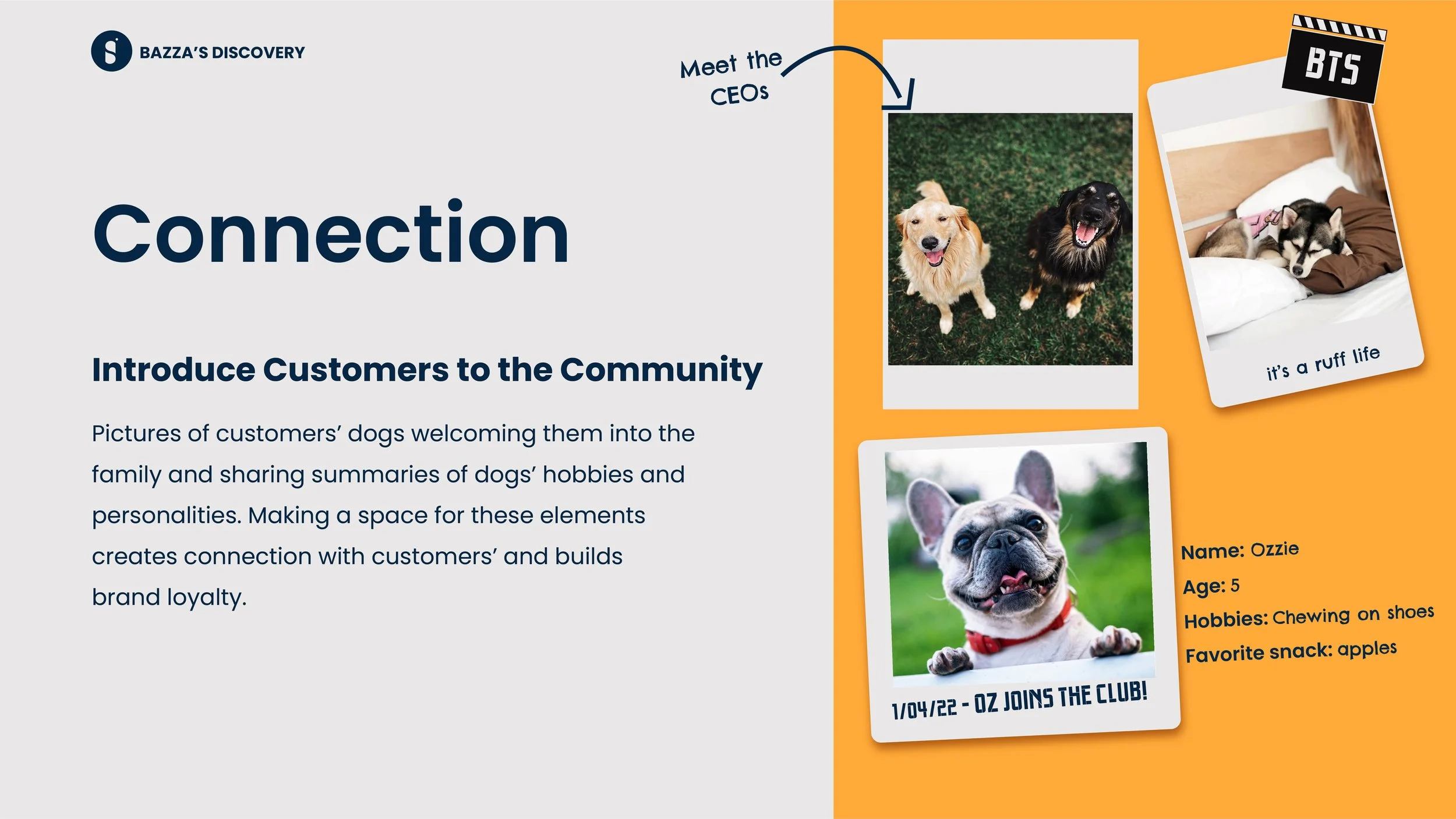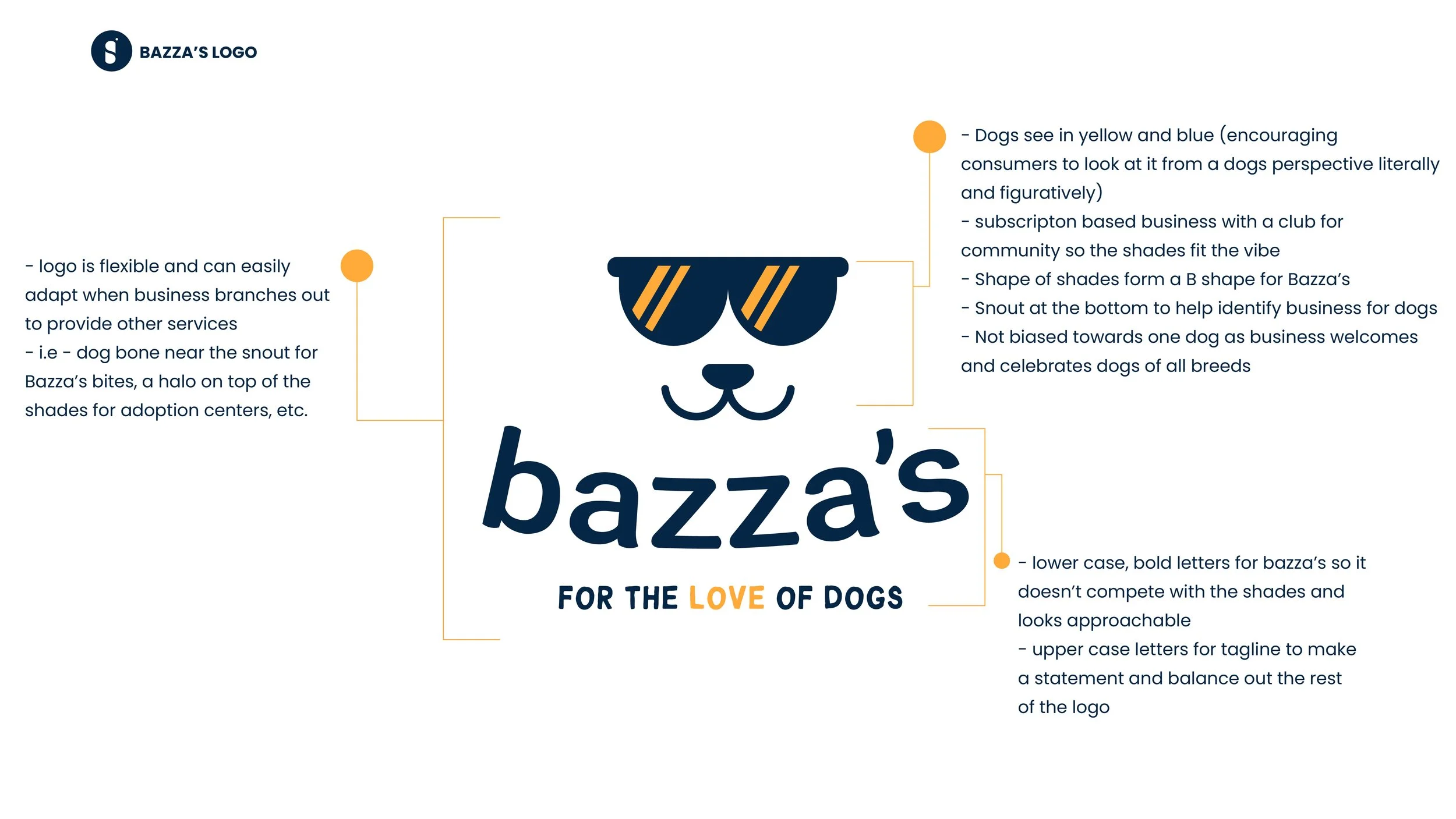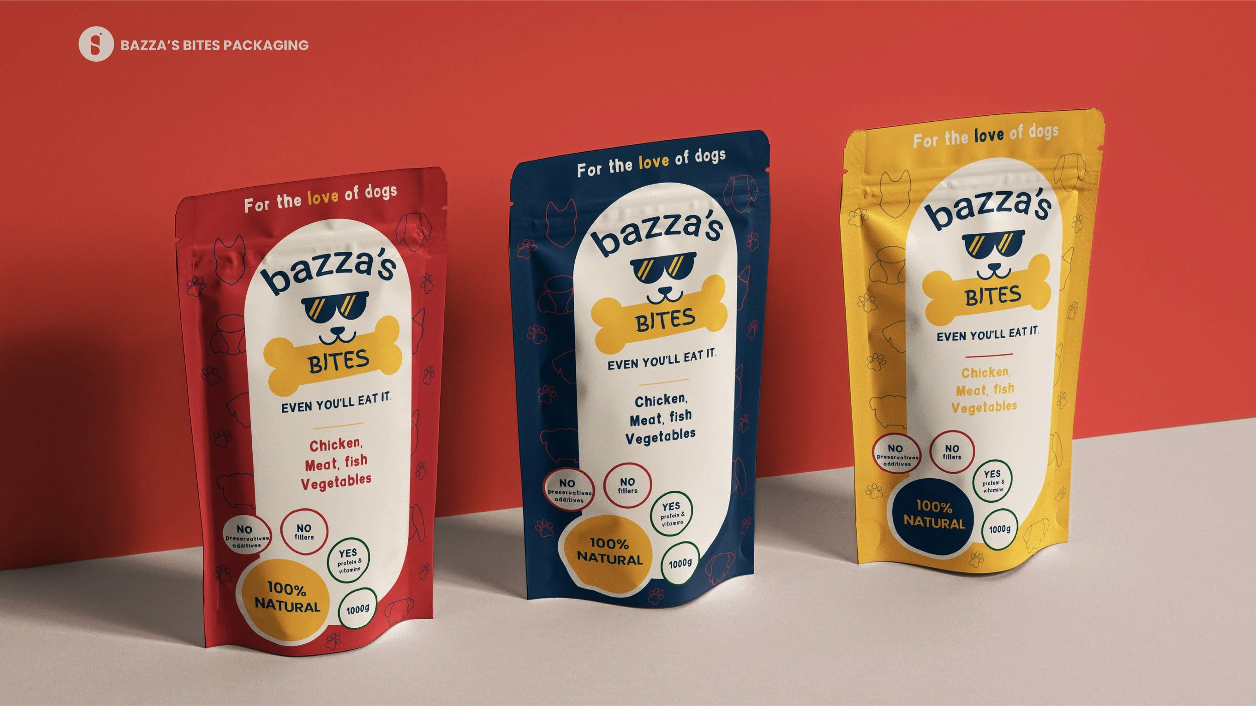 The goal was to develop a strong brand for a business in the pet food industry. It was important to do thorough research on competitors and understand the target market in order to convey their goals and expand on it for the future of the business (create short and long-term goals - Micro - create a brand for the food item to keep dogs healthy. Macro - build a community where dogs are loved, cared for and celebrated); doing so will also help us strategically design all the brand elements.