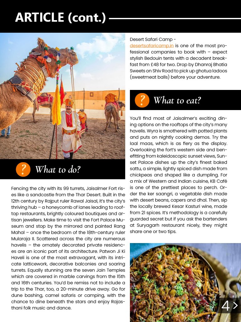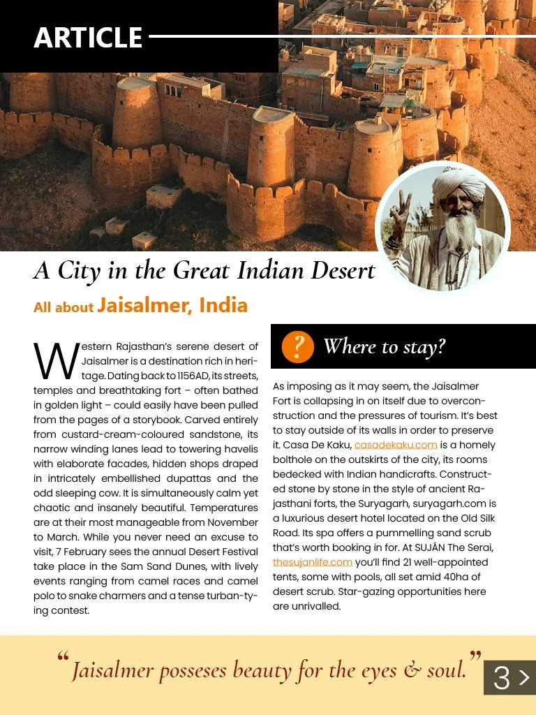 The project went through a brainstorming process with the use of wireframes to identify where to place the text and images'; this helped to stay organized throughout the project and create a cohesive final product. The magazine is designed using consistent font and color palette (black, cream and orange) throughout the magazine for titles, and text. There is good contrast and all elements can be read clearly. The spacing, arrangement and alignment of elements makes it suitable to be viewed on digital platforms and can be printed since considerations have been put to the bleed sections. The project was created by following the guidelines in the rubric and it is presented well, meets design principles and the interactive elements work well.