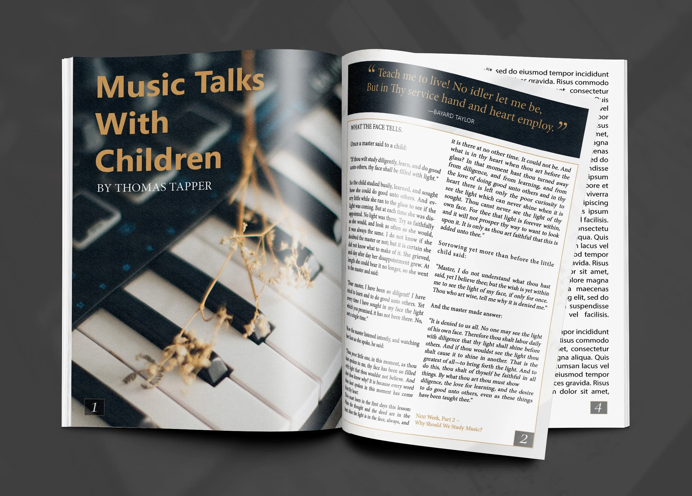 Create a magazine layout for an article selected using Adobe InDesign. The article chosen to create a magazine layout for was 'Music Talks with Children' by Thomas Tapper.