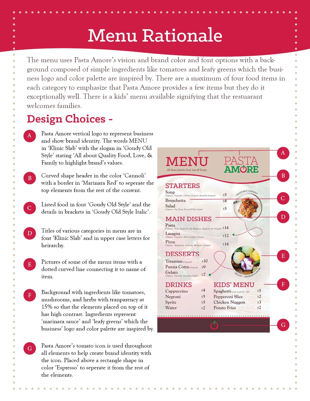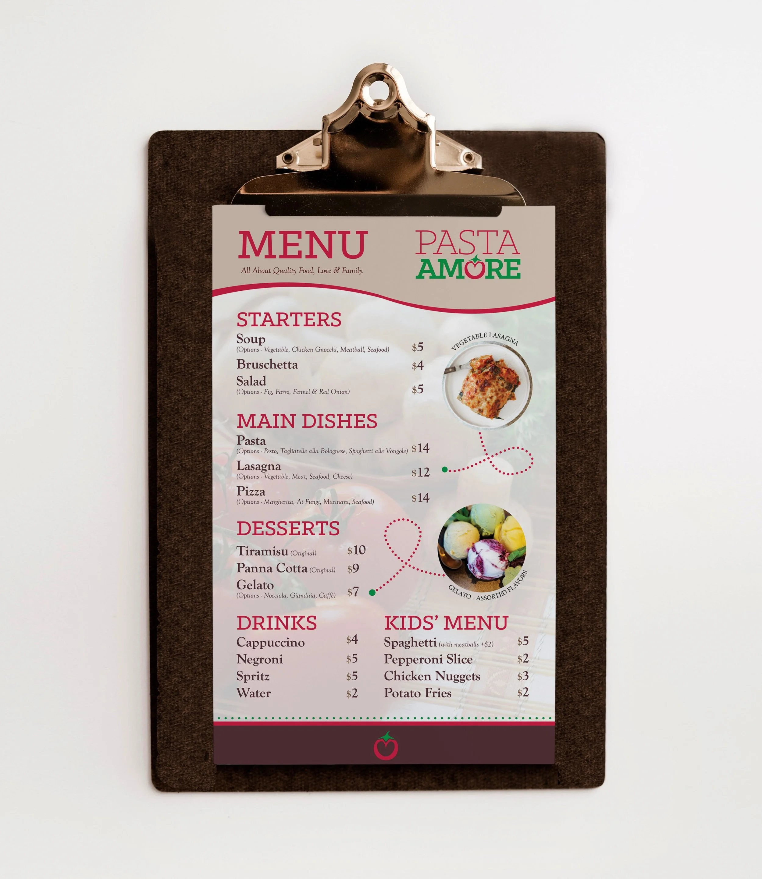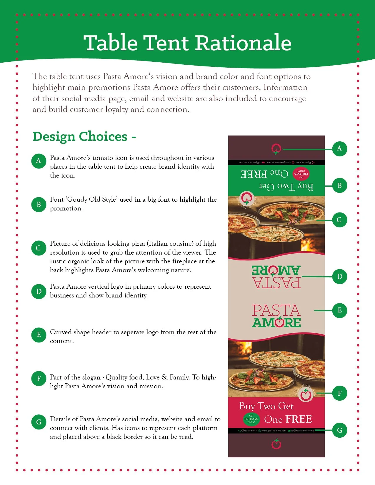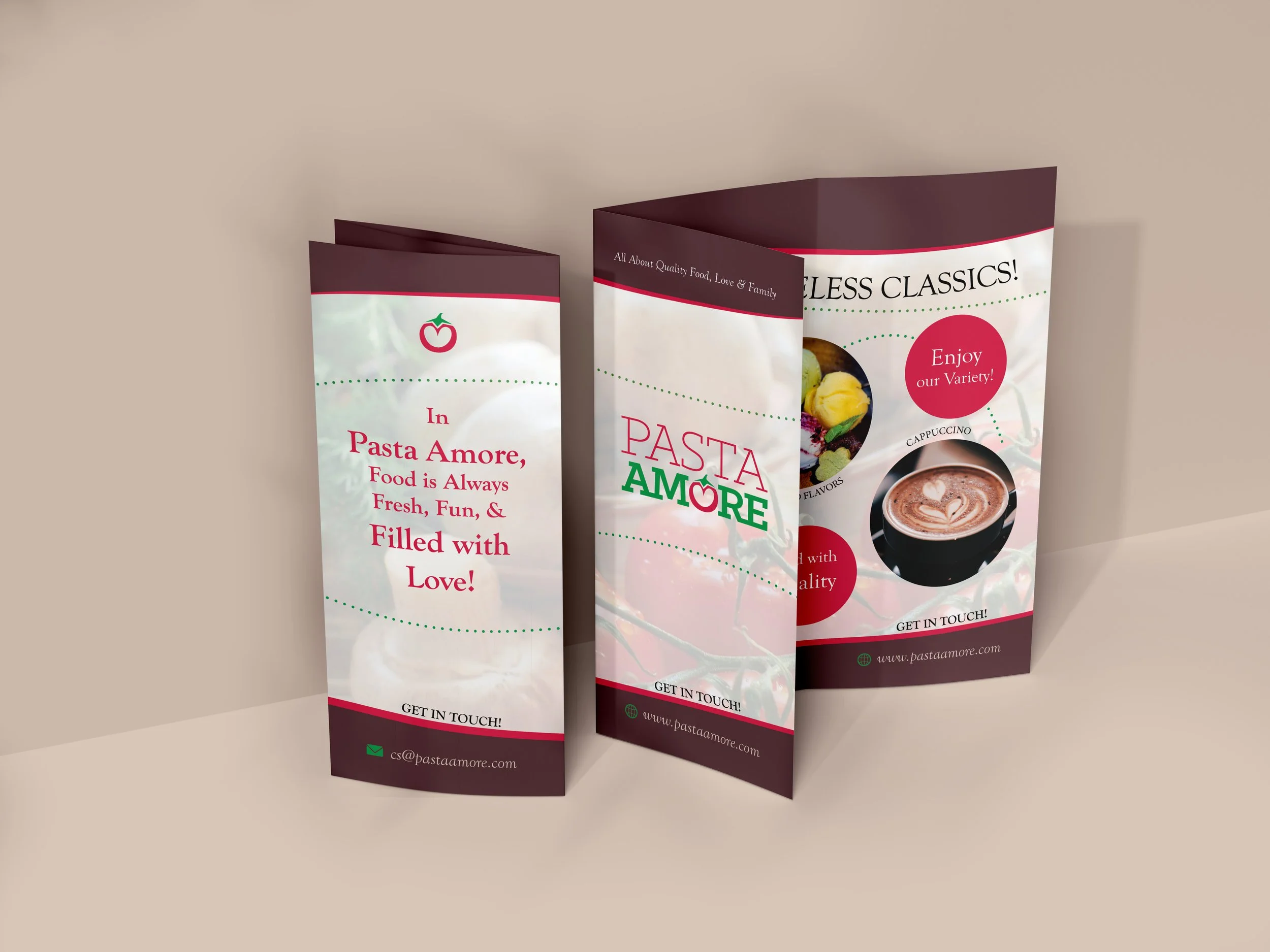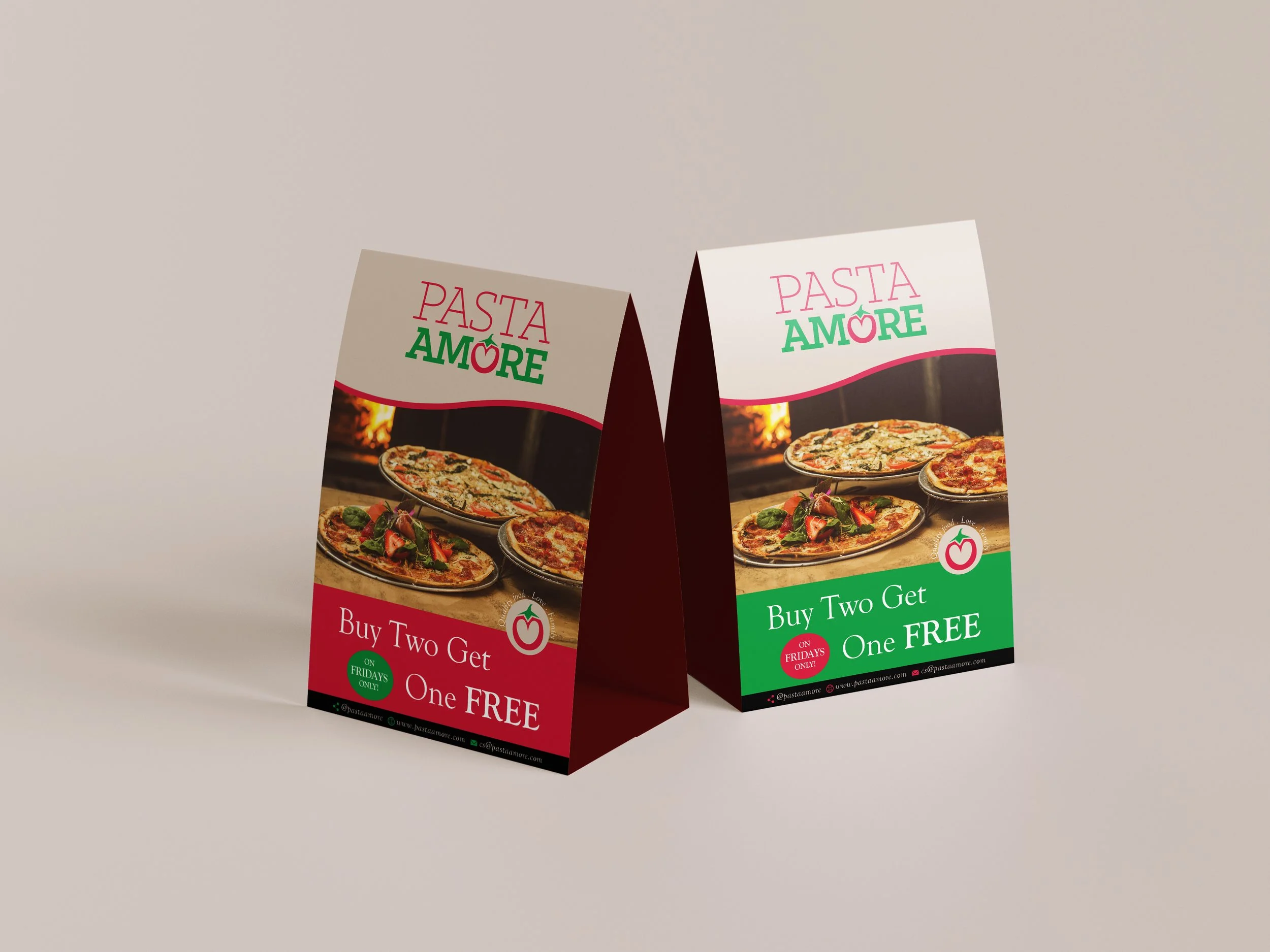 Design a table tent, menu, and brochure for Pasta Amore using the brand identity guidelines.