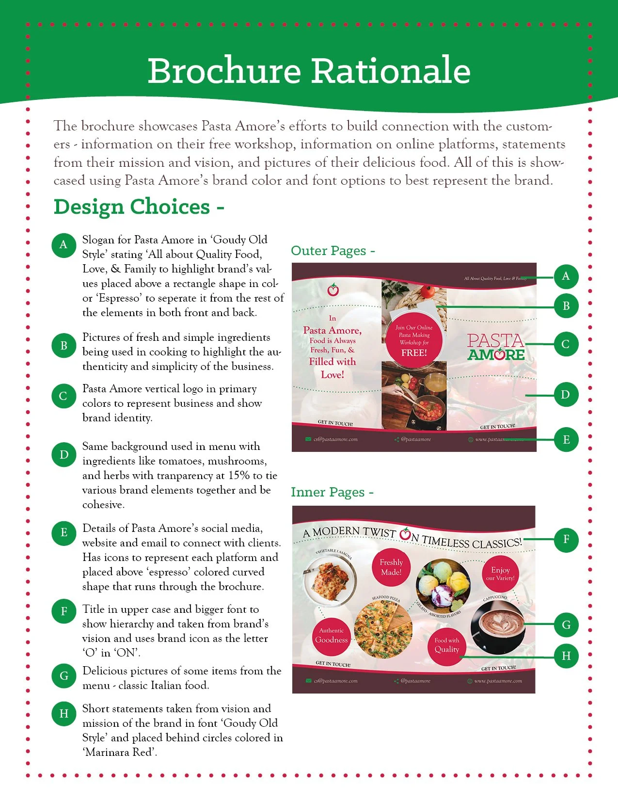 The brand collateral for Pasta Amore was designed using Adobe XD. There are mockups of the designed print elements that were created using Adobe Photoshop to bring the design to life in the final presentation as well. The menu, table tent, and brochure are created with attention paid to bleed sections. The project was created by following the rubrics and Pasta Amore’s brand guide – from the color palette and font to logo usage and arrangement. The three pieces are created with similar decorative elements to tie them to the brand and its identity. There is good contrast in all the pieces, the text is aligned accordingly, the choice of words matches the brand’s messaging, and the pieces and presentation use decorative elements like blocks of color and dotted lines to add interest and frame the items inside the pieces well. There is also appropriate use of images to suit what the business is about. Overall, the design conveys the brand’s values and identity successfully.