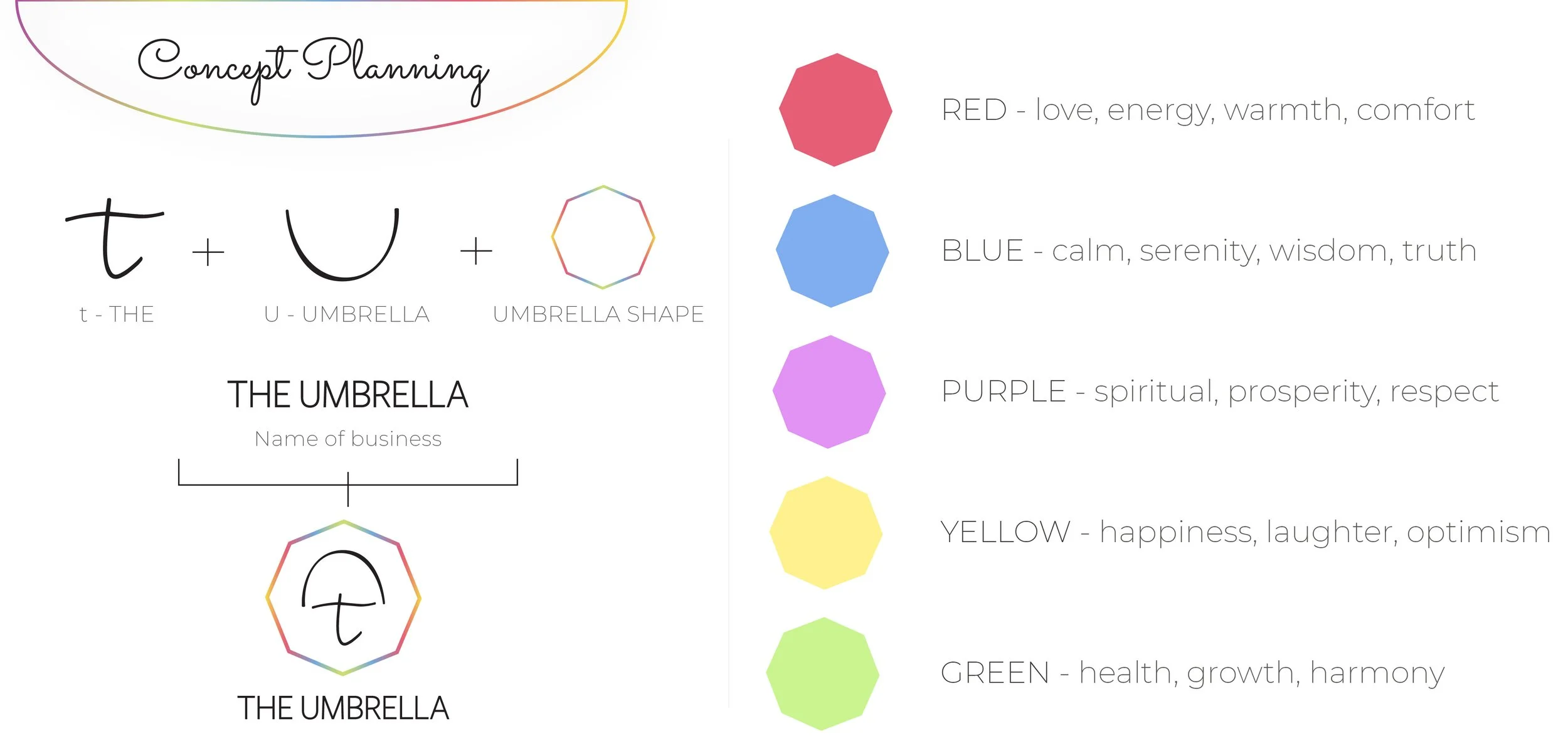 The logo is designed in Adobe Illustrator using 2 flowy shapes making a U and t to make the umbrella shape in order to suit the business name. The wordmark is created using a sans serif font to look modern, convey simplicity, and creativity. The tagline is done using a script font to also convey creativity, freedom and joy.