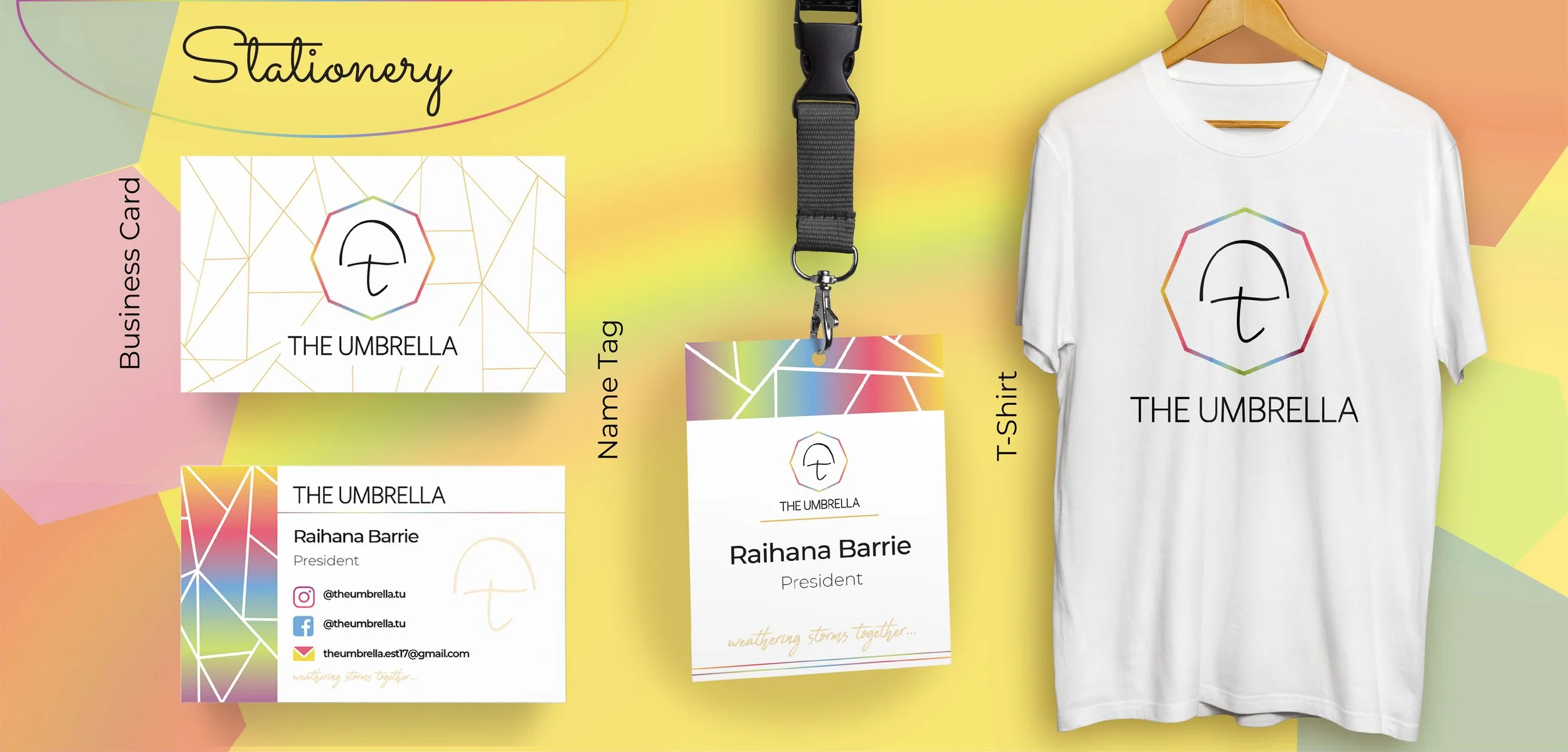 The stationery designs and a T-shirt design have been designed using the logo and color palette with a brand pattern that looks like shards of glass connected to make one cohesive picture behind a gradient that looks like a rainbow - this helps signify the unification that The Umbrella envisions.