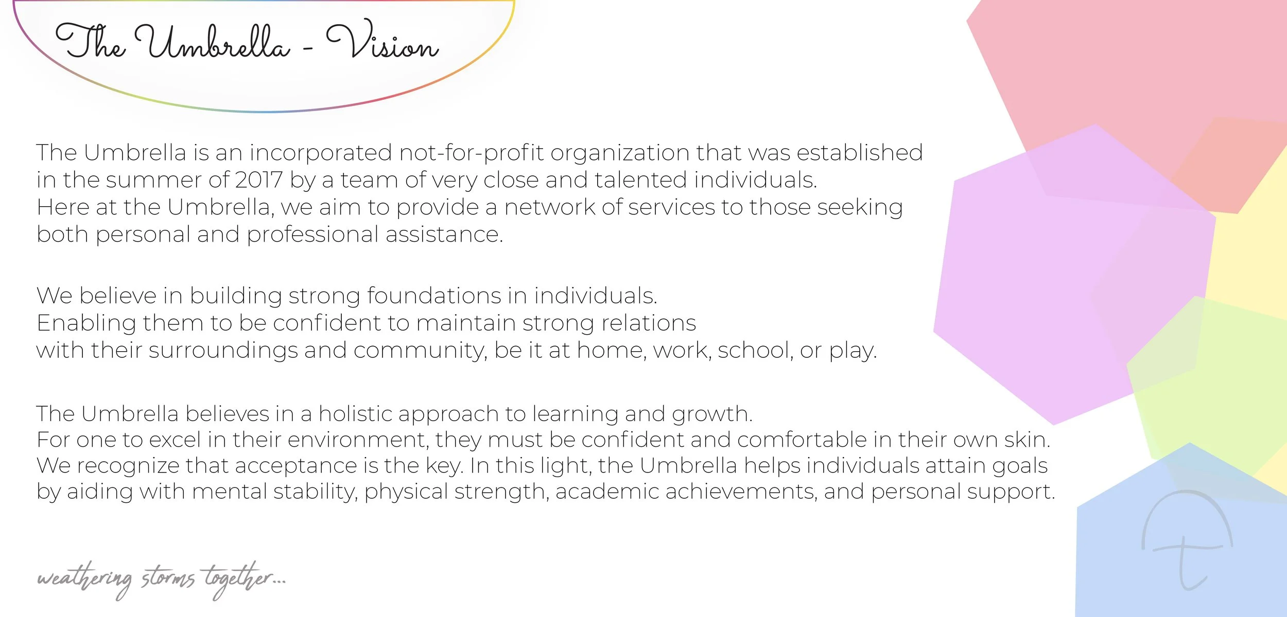 The Umbrella is a non-profit organization that showcases the skills of talented individuals and hosts events to collect money for charities. They take a holistic approach to learning and growth. They believe that for one to excel in their environment, they must be confident and comfortable in their own skin. They recognize that acceptance is the key. In this light, the Umbrella helps individuals attain goals by aiding with mental stability, physical strength, academic achievements, and personal support.