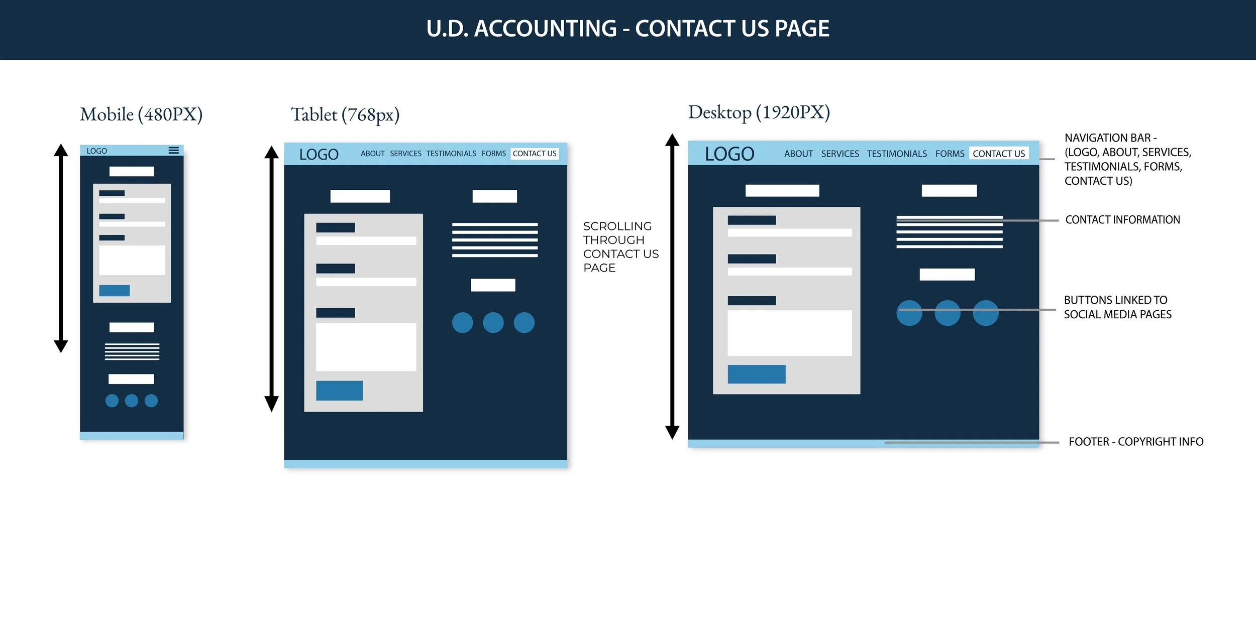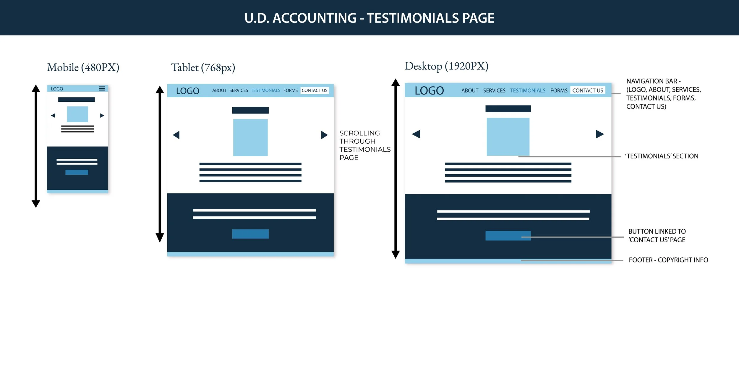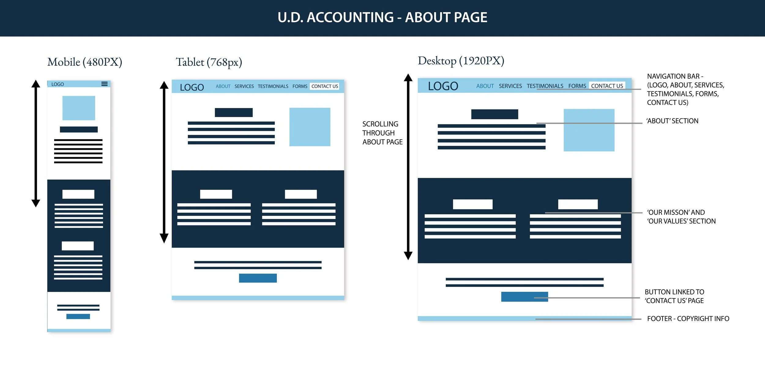 In the wireframes the structure of content is different for the mobile, tablet, and desktop. There are breakpoints that are inserted so that the content will not be crowded on smaller screens; this will enable users to scroll through and see all the images and buttons and interact with them without any issues. The website also follows the brand style guide and is consistent with font and color usage and messaging throughout all pages.